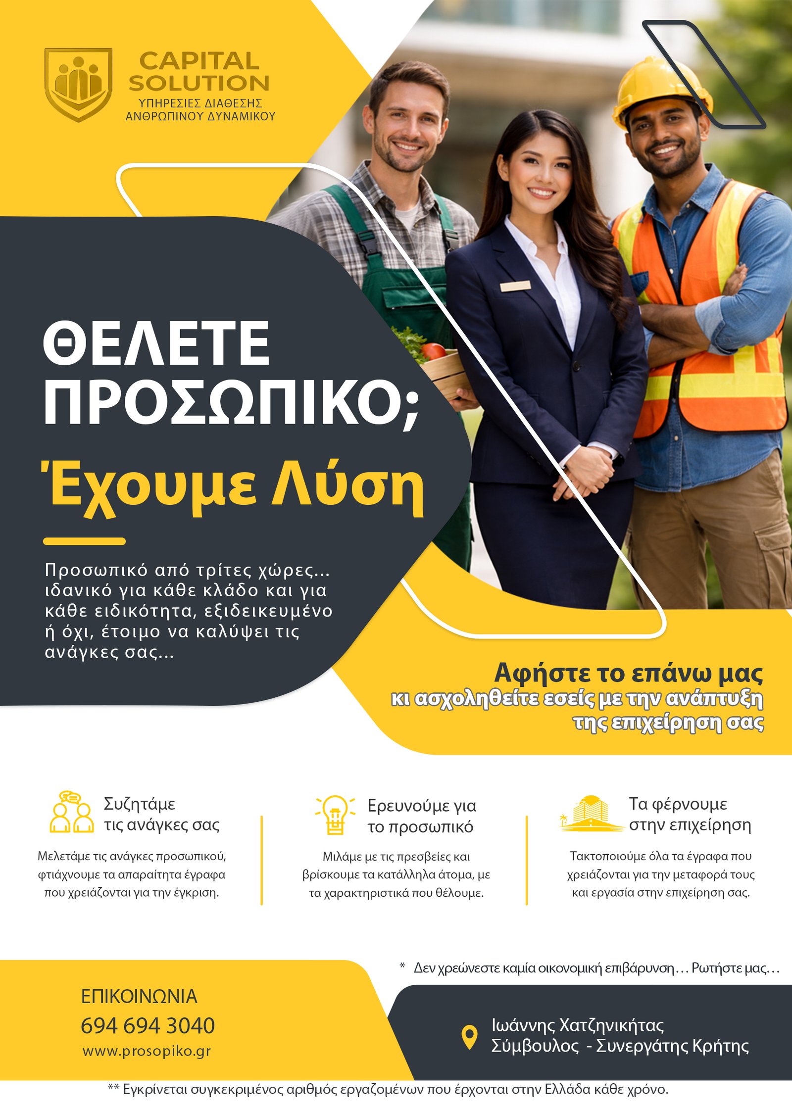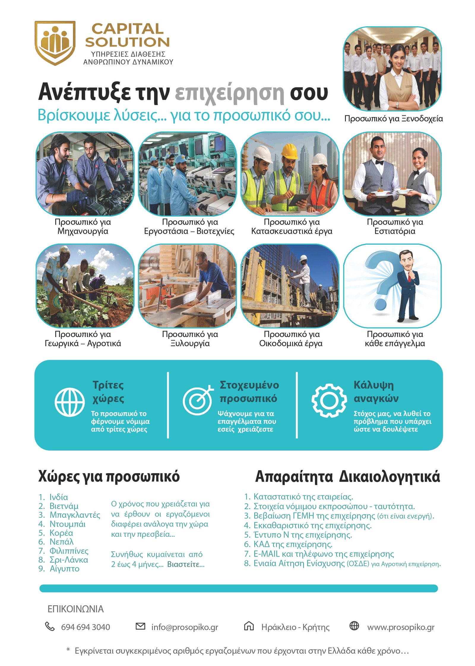 Βάση τις ανάγκες που έχετε φέρνουμε προσωπικό από τρίτες χώρες, εξειδικευμένο ή όχι έτοιμο να καλύψει τα κενά, ώστε να λειτουργήσει η επιχείρηση σας σωστά...